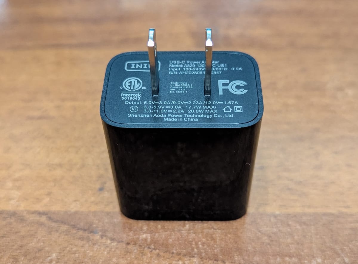 The supplied USB-C PD charger is specified as being capable of 5V3A, 9V2.3A, or 12V1.7A. Has an ETL logo; hopefully, it's real and not just a 'fake' logo. During a charge cycle, the adapter only gets slightly warm.